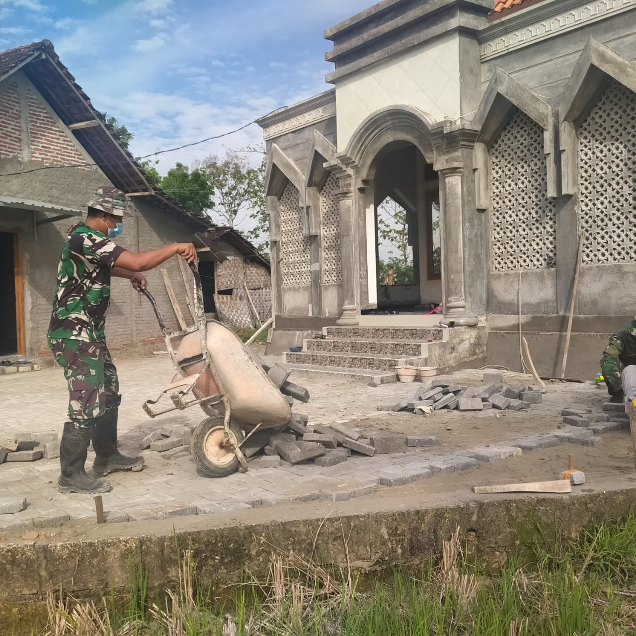 Berada di halaman Masjid Baitul Muttaqin Desa Tamansari, anggota satuan tugas TMMD berkegiatan. Disana mereka terlihat sedang sibuk membantu pembangunana halaman terasnya.