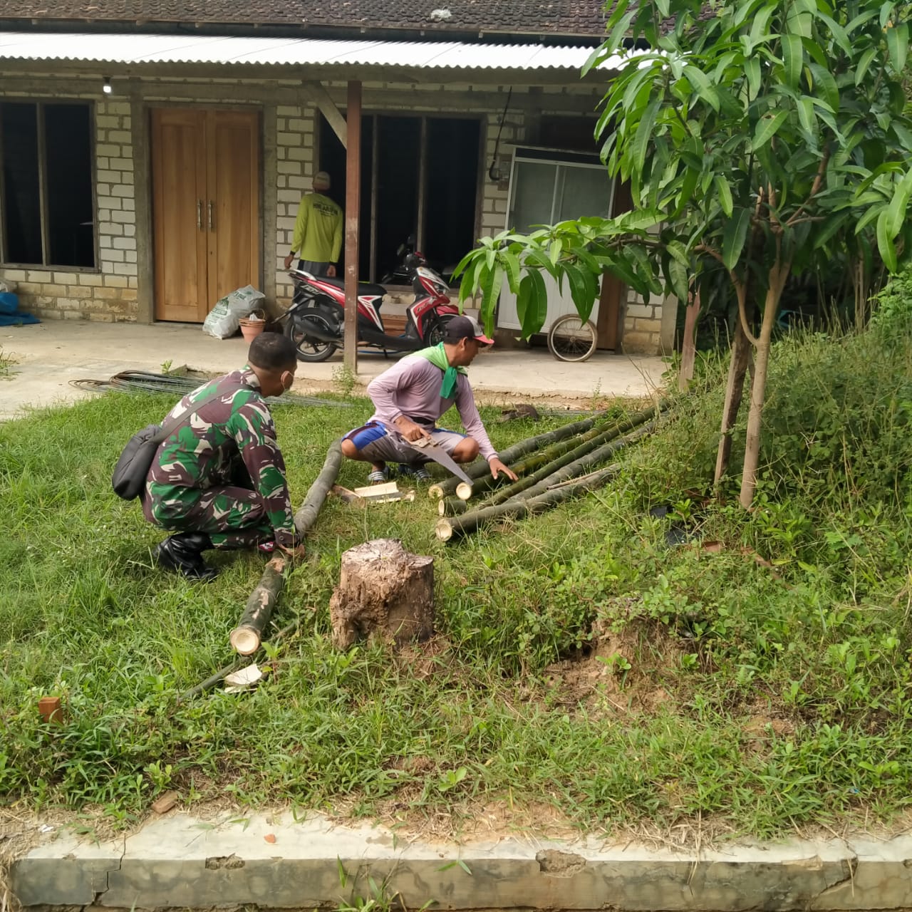 Pati- Semangat kerja membangun begitu terlihat dalam diri para anggota satgas TMMD Reg- 111 Kodim 0718/Pati, Kecamatan Jaken Kabupaten Pati. Mereka saat ini sedang membantu mempersiapkan pohon Bambu untuk digunakan menjadi tiang penyengga sementara di rumah milik Samsuri.