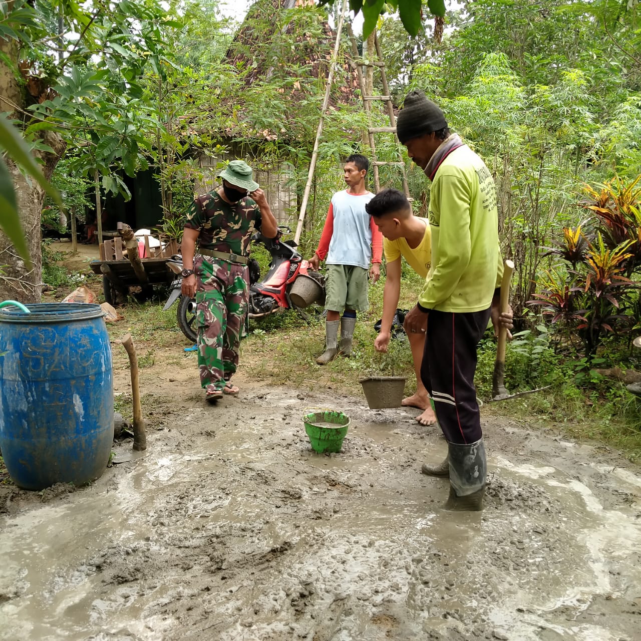 Langit Desa Tamansari yang terlihat mendung menjadi saksi sekelompok anggota satuan tugas TNI dan warga yang sedang beraksi, mengaduk dan melangsir adukan semen di pembangunan rumah milik Sukandar(60).