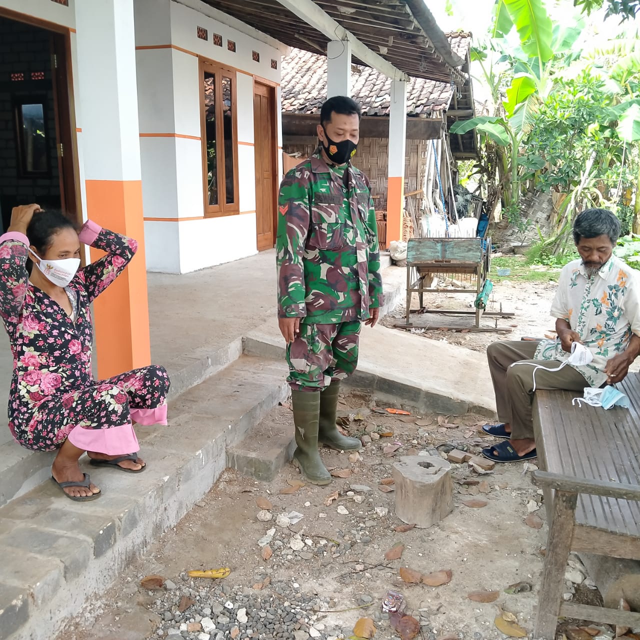 Kopral satu TNI Siswanto(37) terlihat sedang membagikan masker kepada warga desa yang belum menggunakan masker, kebetulan saat dia sedang melintas dipemukiman warga dan melihat ada warga yang sedang berkumpul di depan teras rumahnya dengan tidak memakai masker, dia kemudian memberikannya masker.