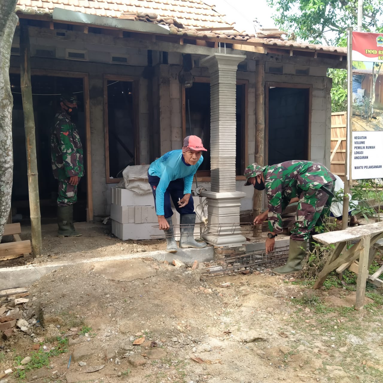 Sersan satu Ari Asman(39) misalnya, dia sangat bersemangat membantu pekerjaan dari Sakiman(50). Saat itu sedang mempersiapkan rangka Besi untuk pengecoran Balok riang atas yang ada di dalam rumah.