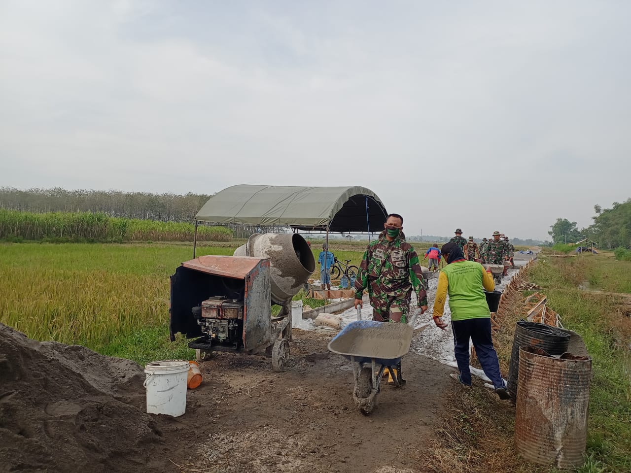 Terlihat anggota TNI satuan tugas TMMD dan Warga sedang berjibaku dengan molen dan adukan, mereka begitu bersemangat mengebut pembuatan jalan beton di Desa Tamansari. Warga pun seakan tidak mau kalah dengan TNI, mereke menggenjot kekuatannya untuk pembangunan jalan didesanya.