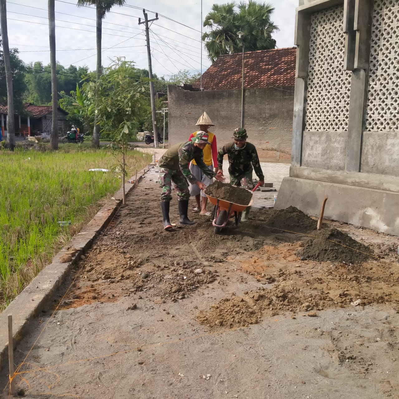 Dilokasi halaman mushola, anggota TNI dan warga saling bantu dalam pekerjaan pemasangan batako untuk pelataran Mushola Nurul Iman di Desa Tamansari.