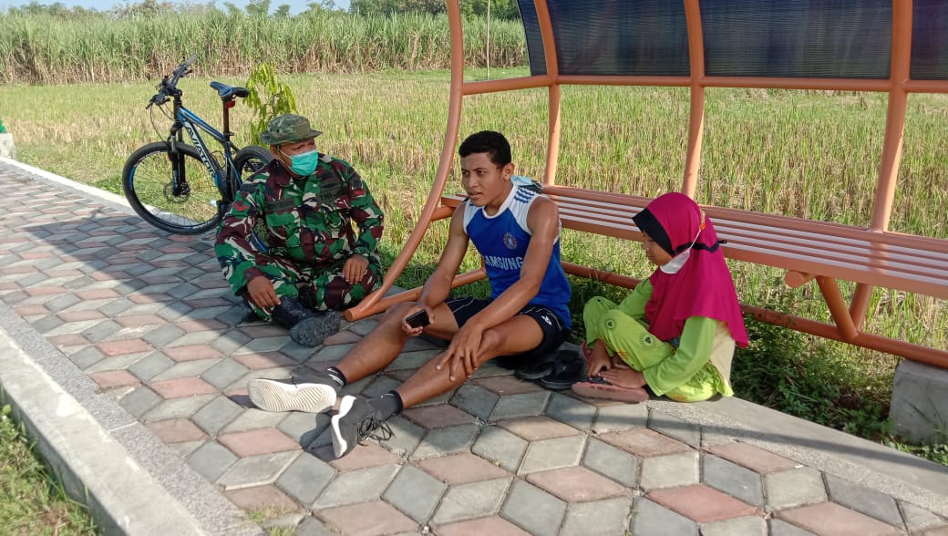 Dipinggiran sawah warga Desa Tamansari Kecamatan Jaken Kabupaten Pati, Koptu Bowo(37) anggota TNI Kodim 0718/Pati terlihat sedang duduk bersama dengan warga desa yang tengah melaksanakan olah raga pagi.