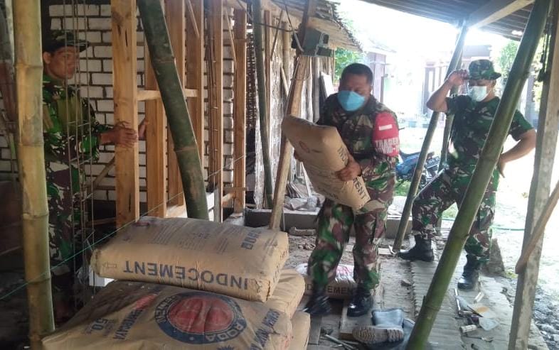 Beberapa dari anggota satuan tugas TMMD untuk bedah rumah tidak layak huni masih terlihat sedang sibuk mengangkat semen dari halaman rumah ke dalam banguna yang sedang direhab, kedatangan material semen ini karena stok semen yang kemaren sudah habis.