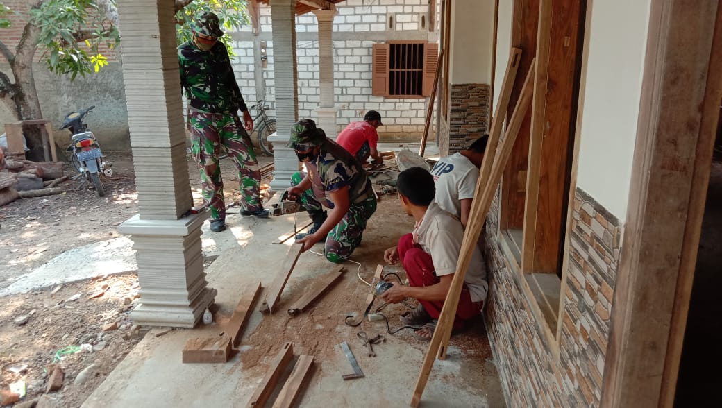 Pati – Anggota Satgas TNI Manunggal Membangun Desa (TMMD) Reguler Ke-111 TA. 2021 Kodim 0718/Pati di Desa Tamansari, Kecamatan Jaken, Kabupaten Pati sedang memastikan kerataan dan kehalusan kayu melakukan serut kayu sebagai bahan jendela RTLH milik Supawi (56) warga dusun kemiri, Rt.04 Rw.01 Desa Tamansari, Kecamatan Jaken, Kabupaten Pati. Senin (5/7/2021)