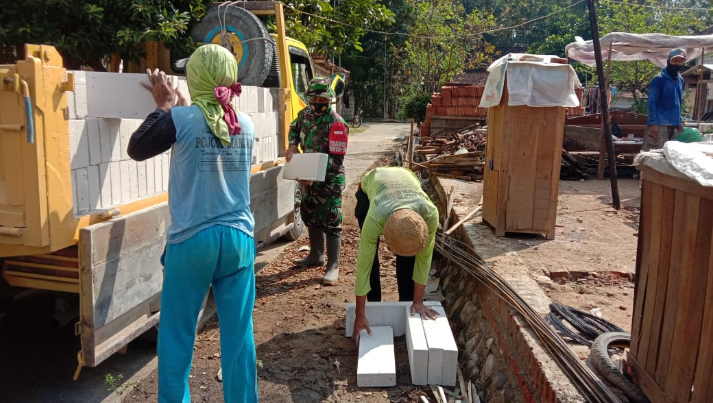 ”Disaat semua sibuk bekerja, dan tiba-tiba dropping material sampai di lokasi, tak ada istilah menunggu tenaga dari orang lain. Kebetulan saya yang agak longgar, Batako itu saya “mainkan”,” ujar Babinsa M. Jumroni.