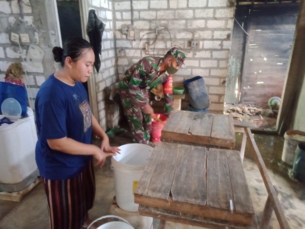 Serka Jam’ani Anggota Satgas TMMD menyambangi tempat ibu Karsini, untuk mengetahui bagaimana cara membuat tahu secara manual. Hal ini di lakukannya untuk memastikan kebersihan dalam pembuatan tahu