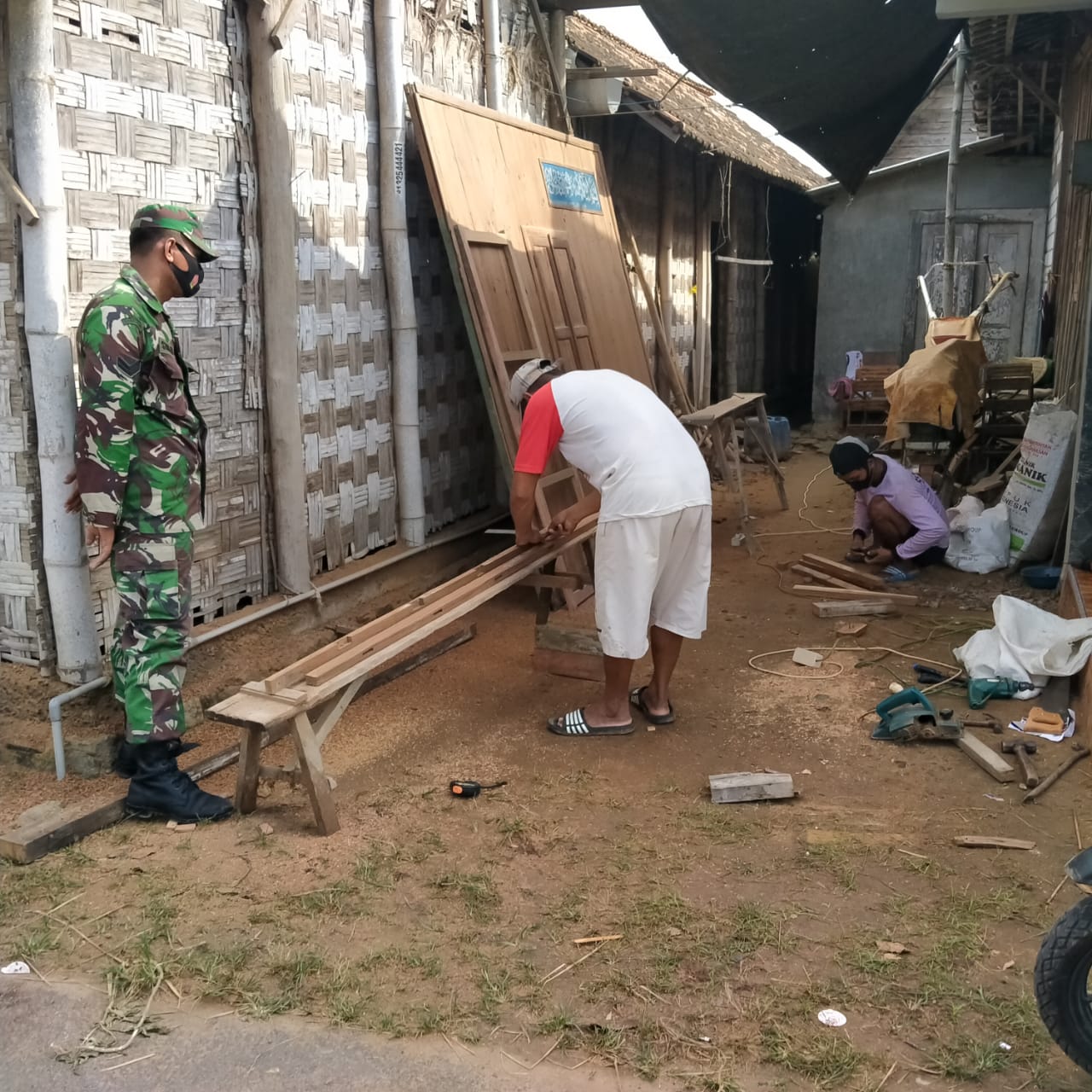 Pati- Terlihat begitu jelaas antusias dari Sertu Sumarno(38), saat dirinya sedang berkunjung ke lokasi pembuatan kusen pintu dan jendela dirumah pembuatan mebel milik Wawan(47) disela-sela waktu kegiatan TMMD Ke 111 Kodim 0718/Pati di Desa Tamansari Kecamatan jaken Kabupaten Pati. Jumat,(25/06/2021).
