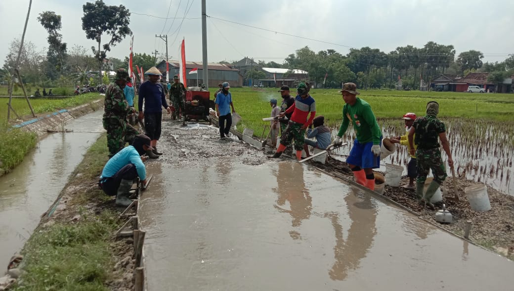 Pati – Kegiatan sasaran fisik rabat beton jalan program TNI Manunggal Membangun Desa (TMMD) Reguler ke-111 Kodim 0718/Pati di Desa Tamansari, Kecamatan Jaken, Kabupaten Pati. Cuaca cerah di lokasi TMMD membuat personel Satgas TMMD dan masyarakat bertambah semangat melakukan pengerjaan rabat beton. Minggu (4/7/2021)