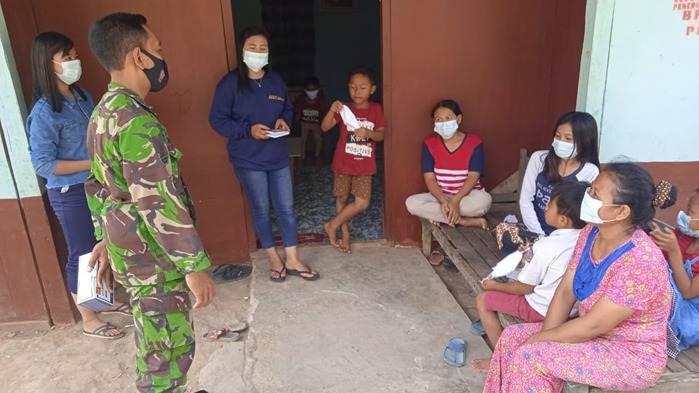 Ibu ibu dan adik adik mari jaga diri kita dan lingkunan kita untuk bersih dan terbebas dari virus covid 19 kalau kita ingin mempunyai umur panjang dan baroqah hendaknya selalu melaksanakan protocol kesehatan’Tutur Sertu Toha Untoro. yaitu menjaga jarak aman,selalu mencuci tangan dengan sabun dan air mengalir hendari kerumunan serta selalu menggunakan masker saat keluar rumah. dalam kesempatan itu pula Satgas TMMD melaksanakan pembagian masker kepada warga .warga kelihatan sangat begitu antusias saat mendengarkan penjelasan mengenai pencegahan penyebaran virus Covid 19.