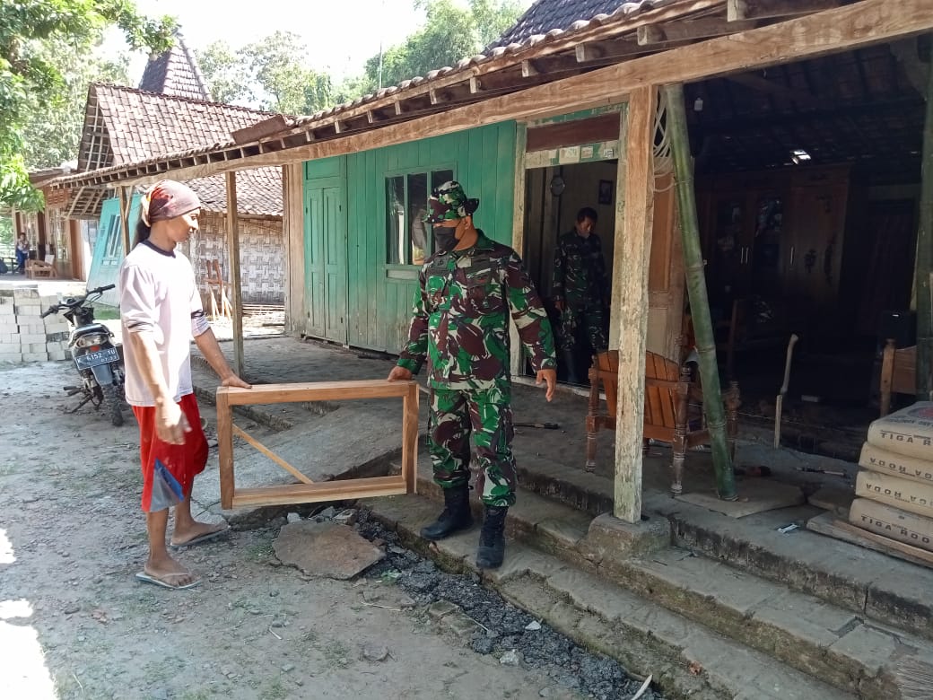 Dalam mewujudkan TNI Manunggal Membangun Desa (TMMD) ke-111 Kodim 0718/Pati, babinsa Desa Tamansari Sersan Jumroni membantu merehap rumah warga di Desa Tamansari, Kecamatan Jaken,Kabupaten Pati, Sabtu (05/06/2021).