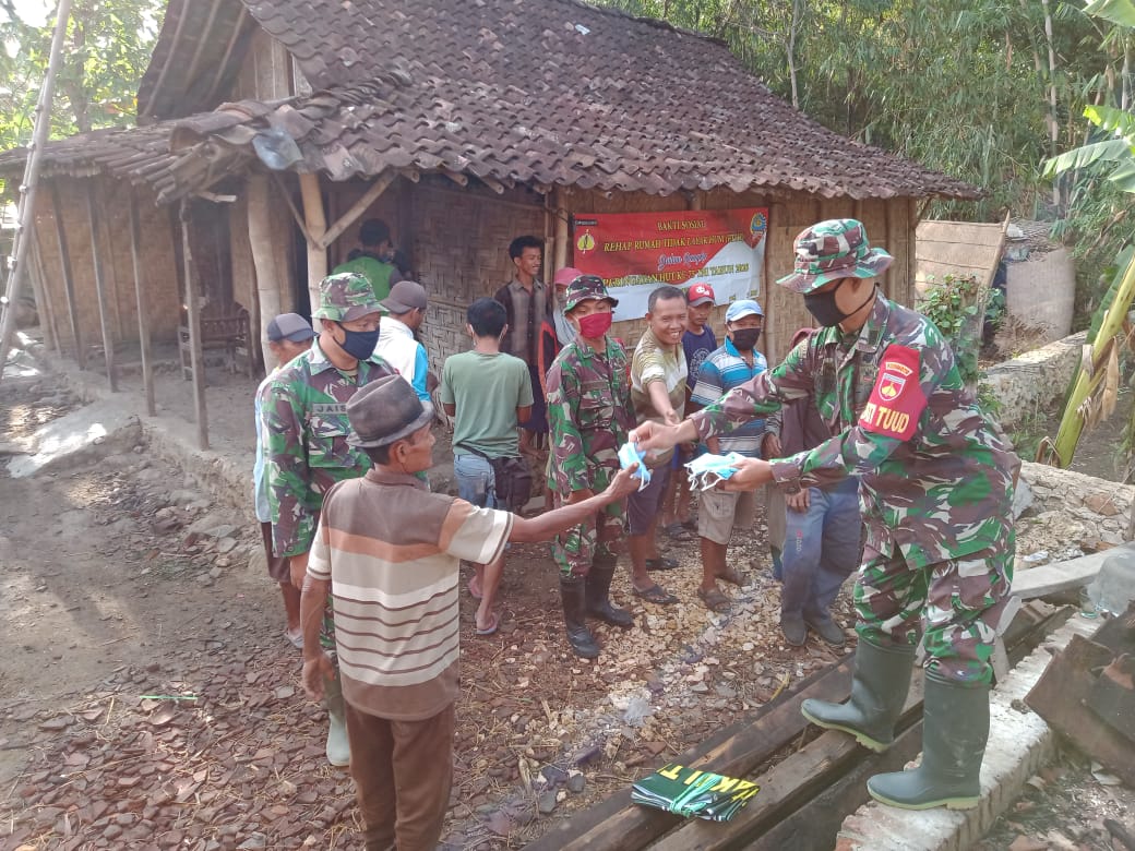Nampak Satgas TMMD sedang membagikan masker kepada warga saat akan melaksanakan pembongkaran rumah salah satu warga Desa Tamansari yang akan direnovasi melalui program pembangunan Rumah Tidak Layak Huni (RTLH), Senin (08/6/2021).