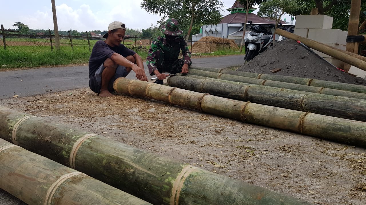 Terlihat puluhan batang bambu petung didepan rumah Ferry (39) warga Dukuh Pandahan, Desa Tamansari, Kecamatan Jaken, yang akan digunakan untuk membuat gubuk di area sawah miliknya. Pemandangan itu yang menarik perhatian Serda Sukarji anggota Satgas TMMD Reguler ke-111 Kodim Pati untuk mengorek informasi dari Ferry tentang keberadaan bambu petung di Desa Tamansari ini, Rabu (23/6/2021).