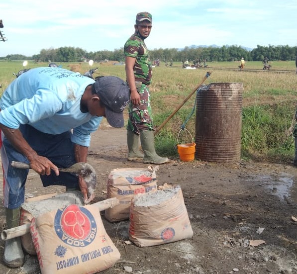 Saat itu sanggota Satgas dan warga di Desa Tamansari,Kecamatan Jaken, Kabupaten Pati. membuat adonan semen dan pasir untuk pengecoran jalan.