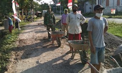 Pati –Antrian tidak hanya terjadi di SPBU maupun di balai desa saat pembagian BLT ataupun pada kantor kantor yang melayani umum Tetapi antrian juga bisa terjadi di lokasi Pembangunan jalan Penghubung antar desa yang berada di Desa Tamansari Kec Jaken Kab. Pati. Para Anggota TNI dan Masyarakat dengan tertib melaksanakan pengantrian untuk mengisi angkong dengan bahan Cor
