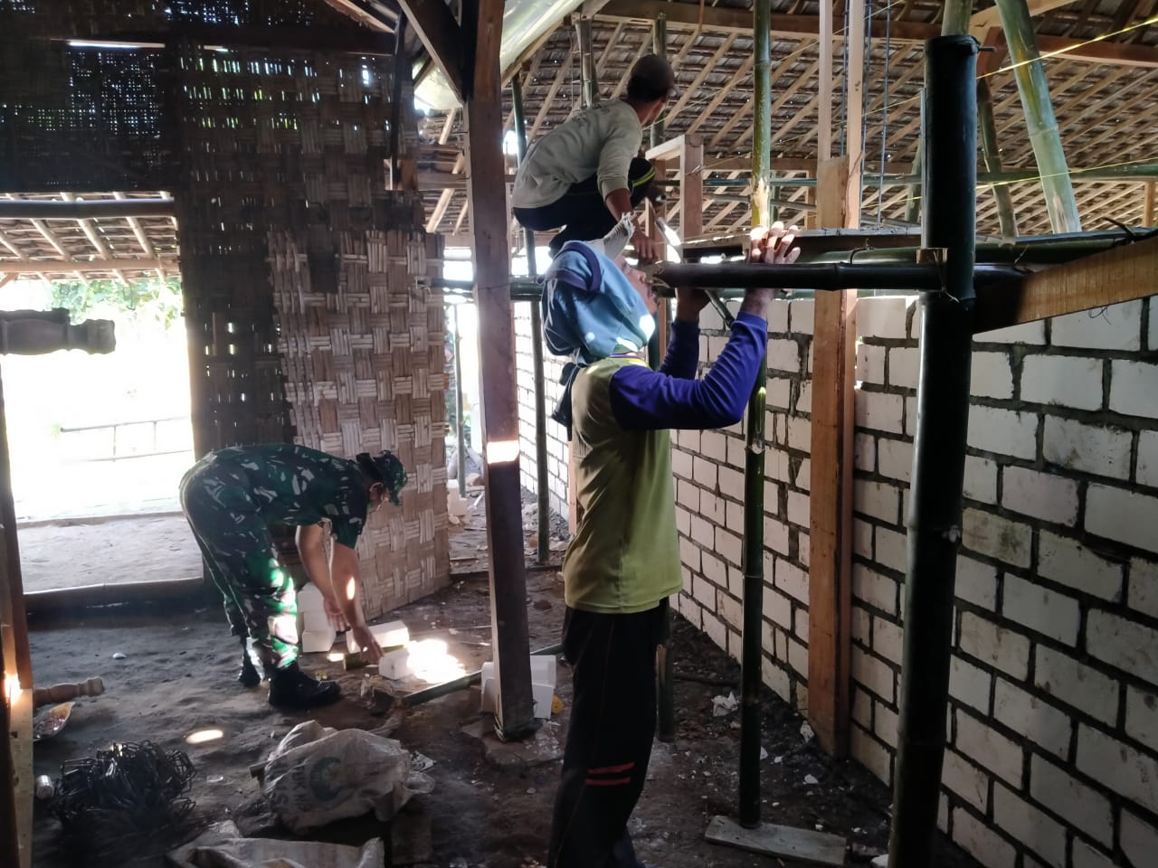 Subakir(38), Sersan Dua TNI tetap semangat setia melangsir bata putih untuk dipasangkan di dinding rumah Sutiah(53) warga Desa Tamansari RT02/RW 02 dukuh Pandahan, Dia berpendapat bahwa dengan semangat kerja yang ikhlas dan tulus badan tidak akan terasa lelah.
