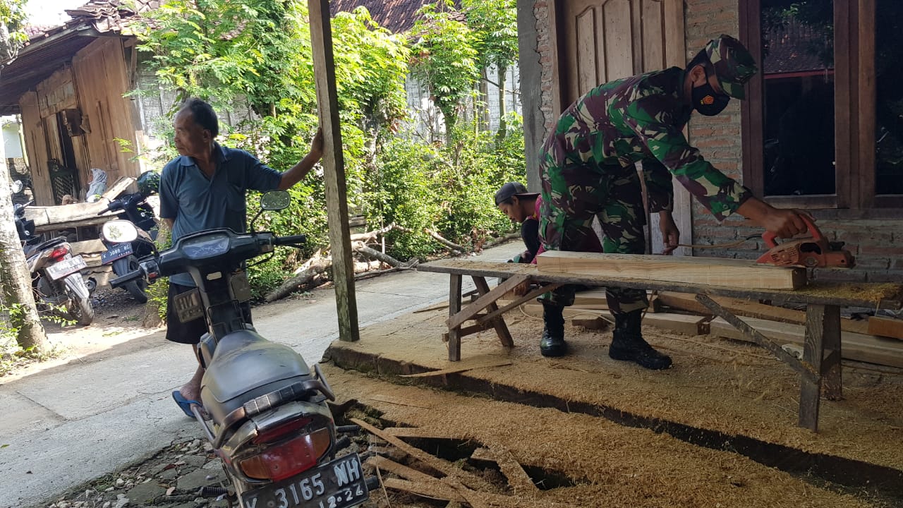 Nampak dilokasi pekerjaan Serda Subakir dengan mahirnya membuat kusen jendela yang dibantu oleh warga, berbekal pengalaman semasa di satuan zeni dan tugas kemanusiaan diluar negri di Kongo ia menjadi sudah terbiasa dalam mengolah kayu menjadi halus dan rapi.
