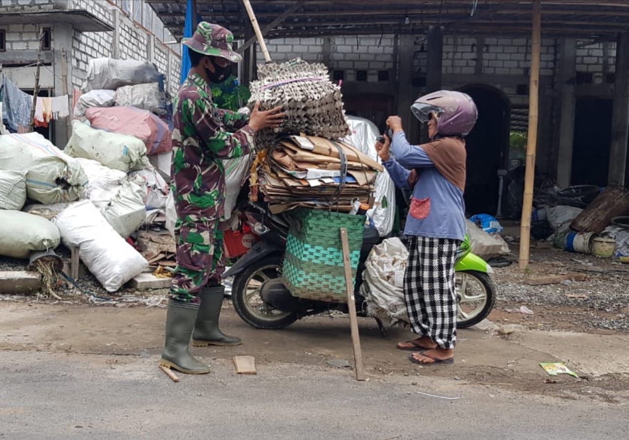 Terlihat Sukarni sedang dibantu Serda Sukarji anggota Satgas TMMD Reguler ke-111 Kodim Pati yang kebetulan sedang bertugas di desa setempat. Ia dibantu Sukarji menurunkan barang-barangnya yang akan dijual ke pengepul barang bekas di Desa Tamansari, Kecamatan Jaken, Rabu (30/6/2021).