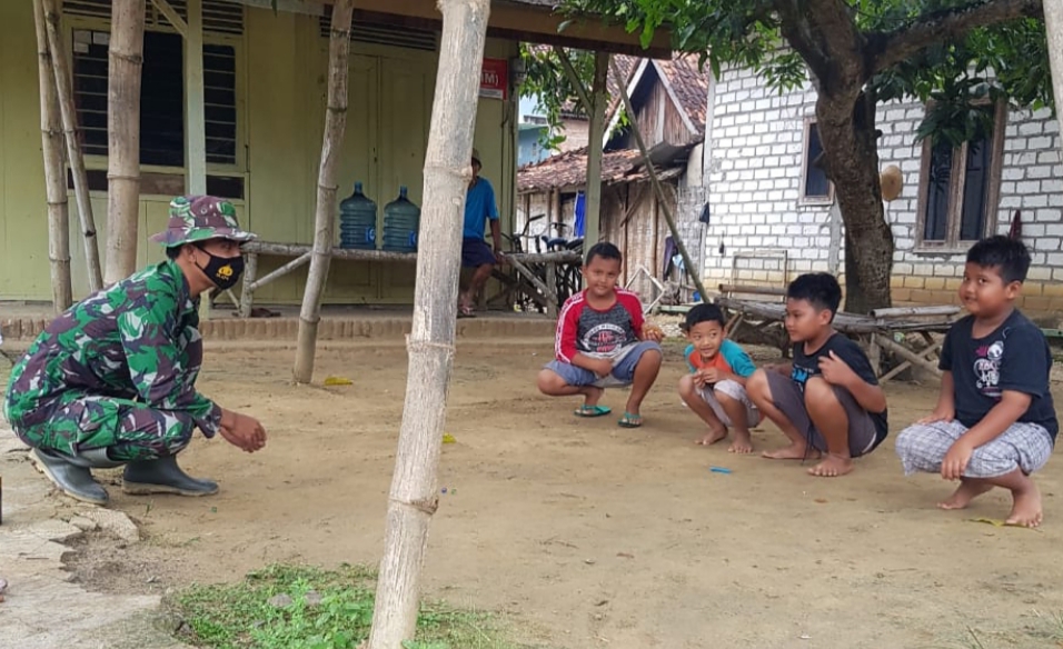 Seperti yang terlihat, salah satu personel satgas TMMD Serda Sukarji sedang bermain bersama anak-anak Desa Tamansari, Sabtu (19/6/2021). Mereka terlihat asyik menikmati permainan yang diperagakan oloh Sukarji.