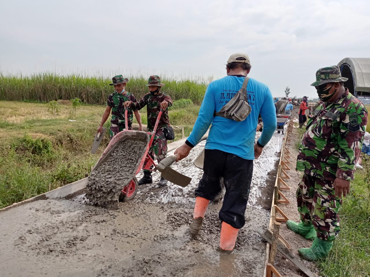 Serda Budi(40), salah satu anggota TNI Kodim 0718/Pati yang juga turut membantu meratakan adukan beton yang sudah dituang ke jalan dalam kegiatan Betonisasi. Sedikit demi sedikit dia ratakan adukan specinya sampai dengan rata garis atas papan ring pembatas pinggirnya.