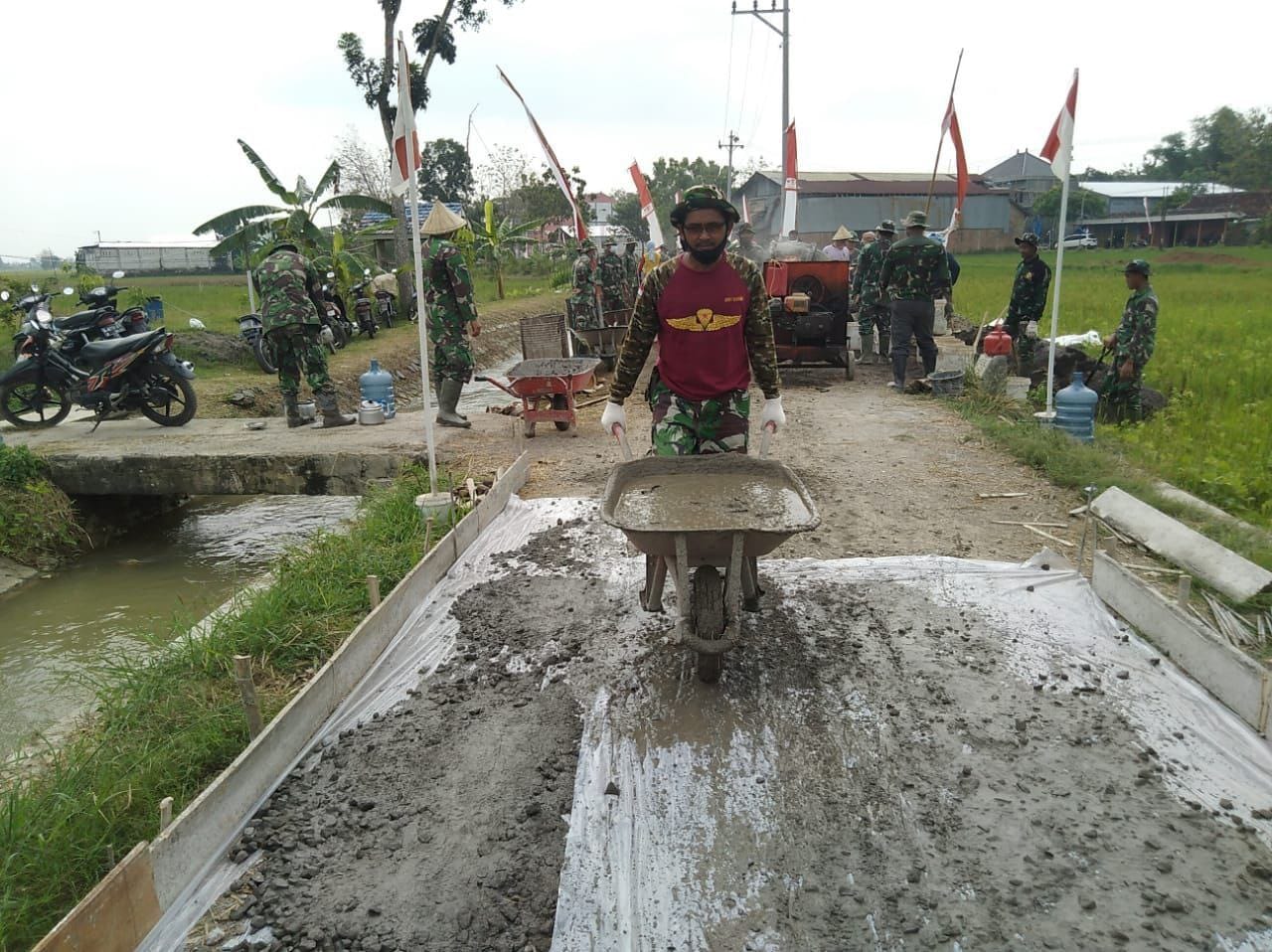 PATI – TMMD 111 Kodim 0718/Pati, suda berjalan 20 hari, berlangsung di Desa Tamansari, Kecamatan Jaken, Kabupaten Pati, Minggu (04/07/2021). Namun selain dipakai untuk pemindahan material keras seperti batu, pasir, dan juga semen, mengggunakan angkong atau gerobak dorong untuk pengecoran.