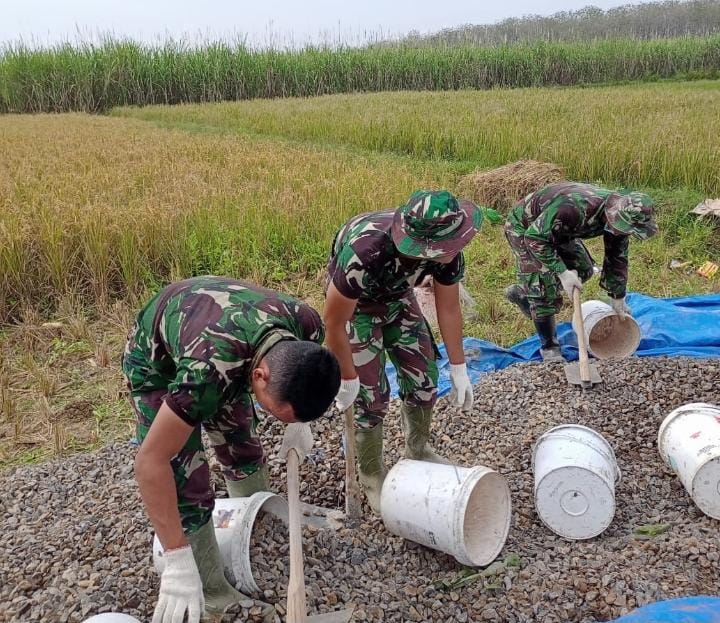 Jalan desa yang menjadi sasaran pembangunan program TMMD di Desa Tamansari ini berada ditengah lahan pertanian warga, sehingga yang biasanya hanya terlihat para petani, kini banyak juga anggota TNI yang ikut ramai disana.