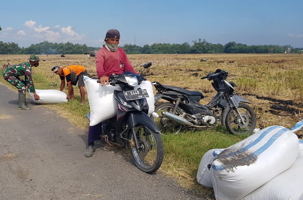 Kali ini Serda Sukarji sedang membantu Bapak Sukarmo (49) Warga Dukuh Kalimati, Desa Tamansari, Kecamatan Jaken, Kabupaten Pati, mengangkat karung berisi gabah untuk dibawa pulang ke rumahnya menggunakan alat sepeda motor, Selasa (13/7/2021)