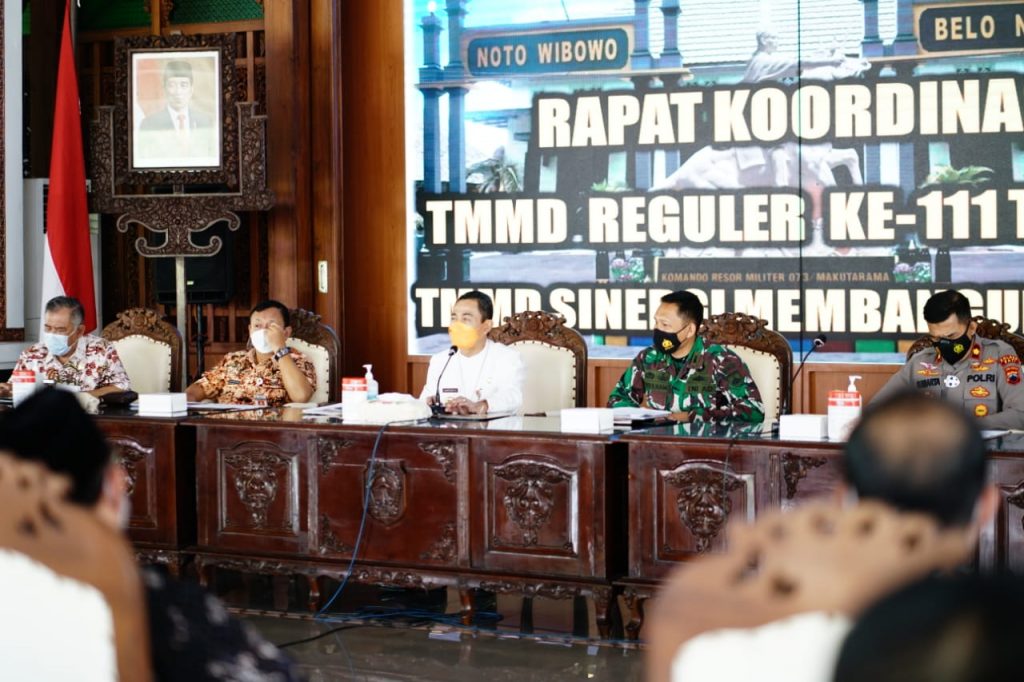 Pati – Bupati Pati Haryanto, Sekda Pati Suharyono, Dandim 0718/Pati Letkol Adi Ilham Zamani, S.E., M.I.Pol. beserta jajaran, Waka Polres Kompol Sumiarta dan sejumlah instansi terkait, Kamis (3/6), menggelar rapat koordinasi TMMD Reguler ke-111 Tahun Anggaran 2021 di Pendopo Kabupaten Pati.
