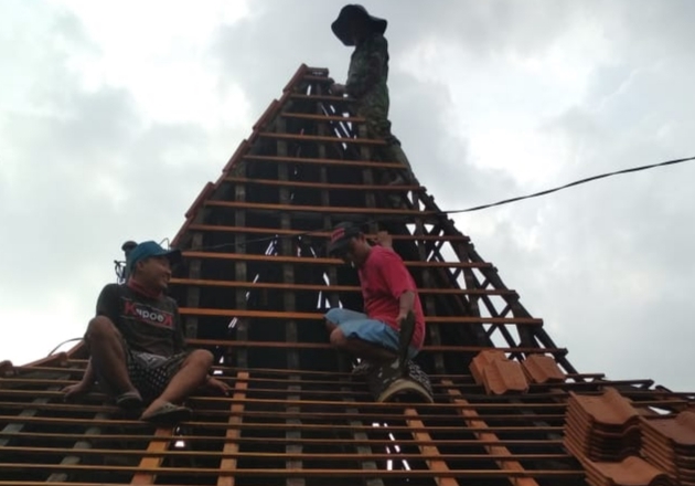 Terlihat diatas bangunan rumah bertengger seorang tentara bersama dua orang warga dibawahnya. Rumah milik Suyat yang direnovasi oleh anggota Satgas TMMD adalah rumah yang berbentuk pencu. Jadi untuk pemasangan genteng diujung atap paling atas agak rumit, pasalnya posisi kerangka atap nyaris tegak lurus.