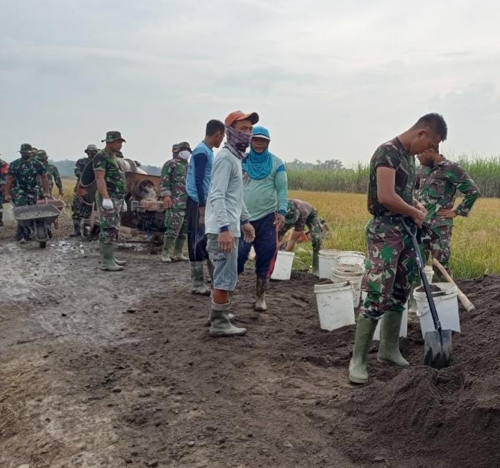 Pati- Semangat yang menggelora anggota satgas TNI Manunggal Membangun Desa (TMMD) Reg-111 Kodim 0718/Pati sangatlah terlihat saat pengerjaan pengecoran jalan area persawahan Desa Tamansari Kecamatan Jaken Kabupaten Pati. Selasa,(29/06/2021).