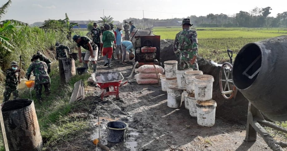Pati – Cuaca pagi diawal bulan Juli terlihat cerah, ini pertanda baik untuk melanjutkan pekerjaan pengecoran jalan sasaran fisik TMMD di Desa Tamansari, Kecamatan Jaken, Kabupaten Pati. Tampak personil Satgas TMMD sudah ready mempersiapkan alat yang akan digunakan untuk mendukung pengerjaan pengecoran. Mulut molen sudah tidak sabar lagi untuk menelan material untuk diaduk di dalam perutnya, Kamis (01/7/2021).