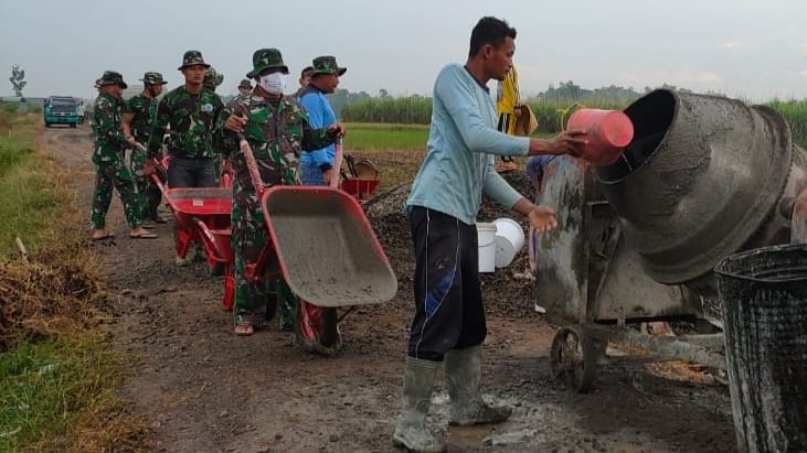Tampak dilokasi mesin molen sudah beroprasi untuk membuat adonan pengecoran, warga beserta satgas TMMD terus bergantian bergotong-royong mengangkut hasil adonan yang akan digelar.