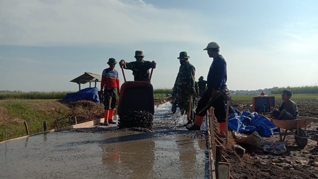 Pagi ini, Satgas TMMD dibantu warga melanjutkan pengerjaan pengecoran ruas jalan persawahan Desa Tamansari, Kecamatan Jaken, Kabupaten Pati, Minggu (20/06/2021). Total jalan ini memiliki panjang 1.450 meter dengan lebar jalan 2,6 meter, serta ketebalan jalan 17 sentimeter.