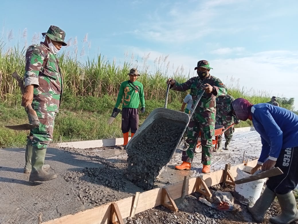 Kegiatan pengecoran jalan sepanjang 1.450 meter yang dikerjakan anggota satgas TMMD bersama masyarakat tidak mengenal cuaca, walaupun terik matahari begitu menyengat samangat satgasTMMD tidak surut sedikitpun untuk berkarya bagi masyarakat Desa Tamansari.