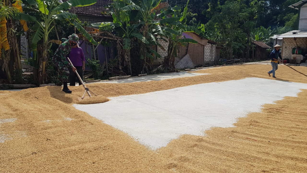 Tampak Sertu Kumedi yang sedang memegang alat bantu gelar gabah sesekali terlibat obrolan ringan. Dalam obrolannya Sarijo mengatakan jika menjemur gabah warga disini mengandalkan matahari sebagai pengering gabah milik mereka.
