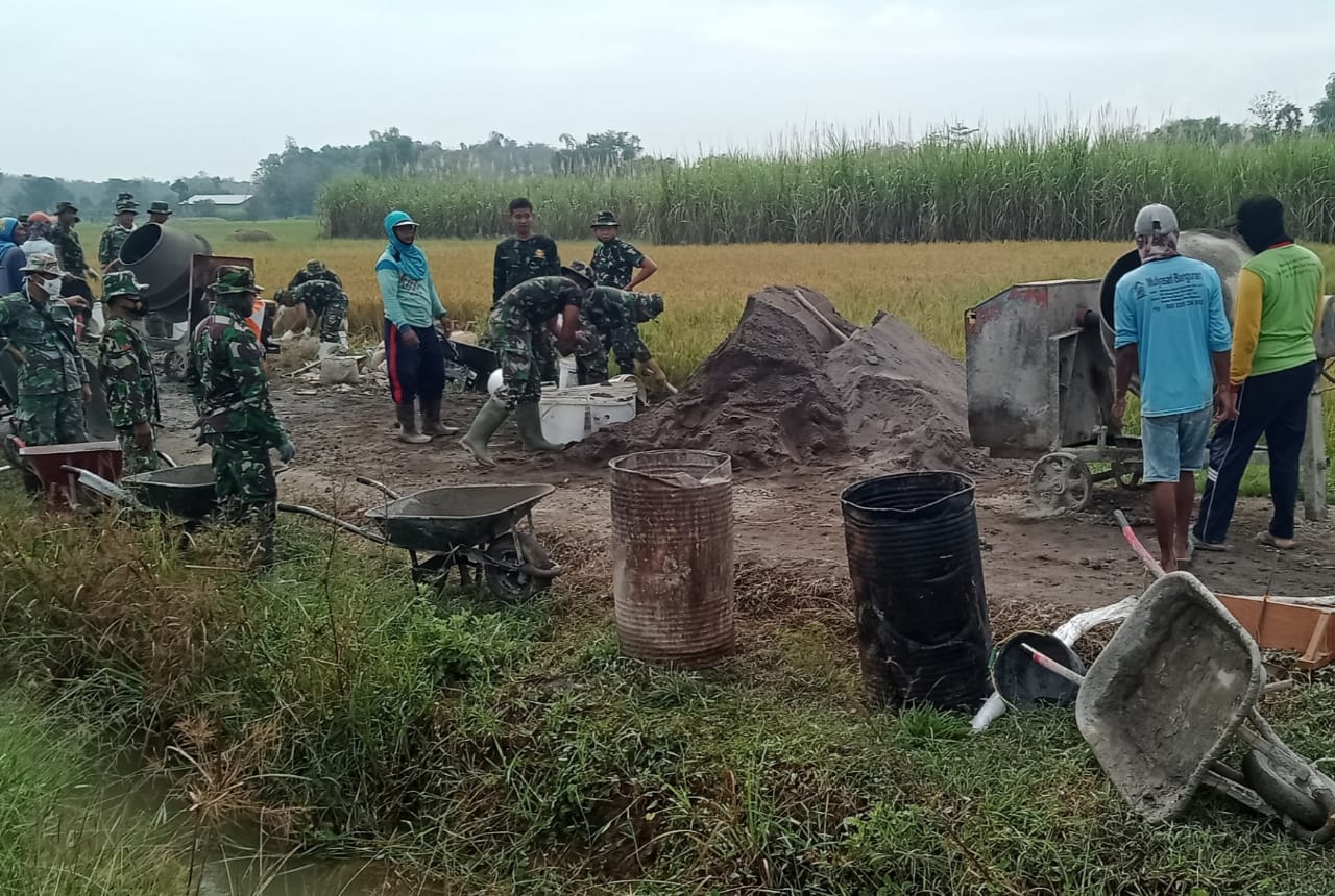 Pati – Pengerjaan sasaran fisik TMMD Reguler ke-111 Kodim Pati di Desa Tamansari, Kecamatan Jaken, Kabupaten Pati, berupa pengecoran jalan pertanian dimulai. Tampak TNI dan warga sudah siap dengan tugasnya masing-masing. Mesin molen mulai berputar, adonan cor mulai siapkan dan angkong pun mengantri disekitar mesin molen.