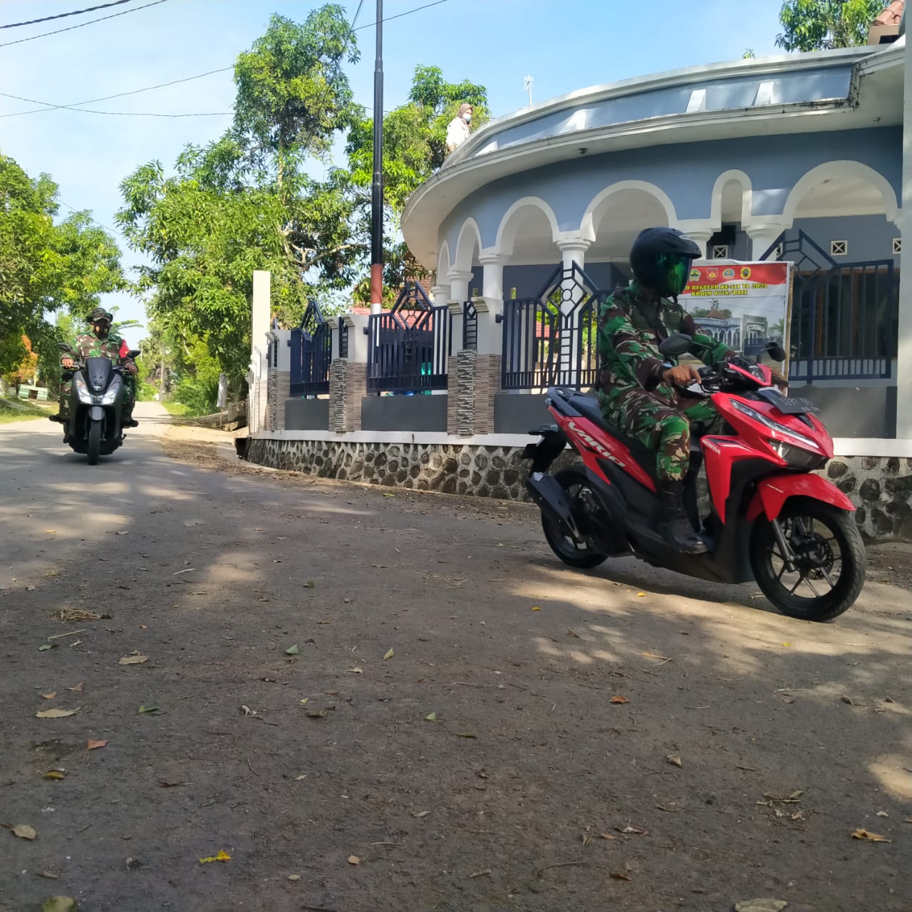 membangun desa (TMMD) Ke 111 kodim 0718/Pati terlihat dengan motornya tiba di halaman masjid