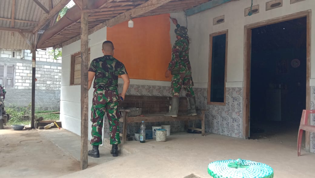 “Bersama rekannya tampak tenang dan konsentrasi saat melakukan pengecatan dinding rumah milik bapak Subekti Priyo. Pekerjaan mengecat yang dibutuhkan adalah ketenangan, kerapihan bukan kecepatan. Apalagi saat mengecat dinding seperti ini”,ujarnya Sertu Muksin.