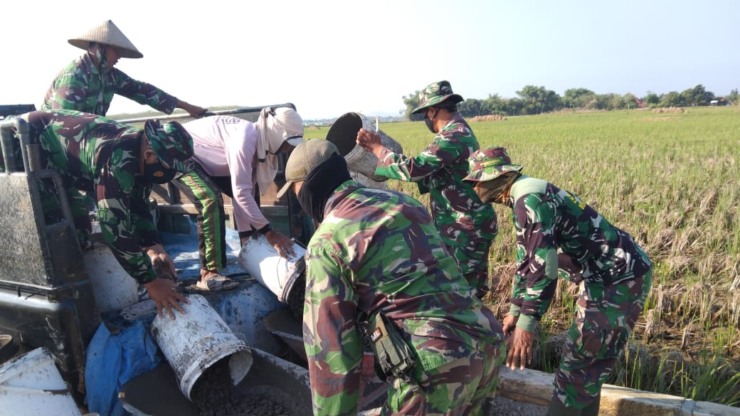 Pati – Kebersamaan dan kekompakan anggota Satgas TNI Manunggal Membangun Desa (TMMD) Reguler Ke-111 Kodim 0718/ Pati dengan masyarakat Desa Tamansari,Kecamatan Jaken, Kabupaten Pati Jawa Tengah, terus berlangsung di lokasi TMMD. Mereka dengan ikhlas ikut mengangkut adukan semen dan pasir bersama warga.