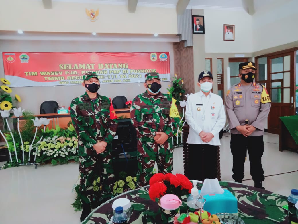 Didampingi Bupati Pati H. Haryanto, SH, MM, M.Si dan Kapolres Pati AKBP Christian Tobing, Dansatgas TMMD Reguler Ke-111 Letkol Czi Adi Ilham Zamani, S.E., M.I.Pol. menyambut langsung kunjungan Tim Pengawasan dan Evaluasi (Wasev) PJO TMMD Reguler 111 TA.2021.