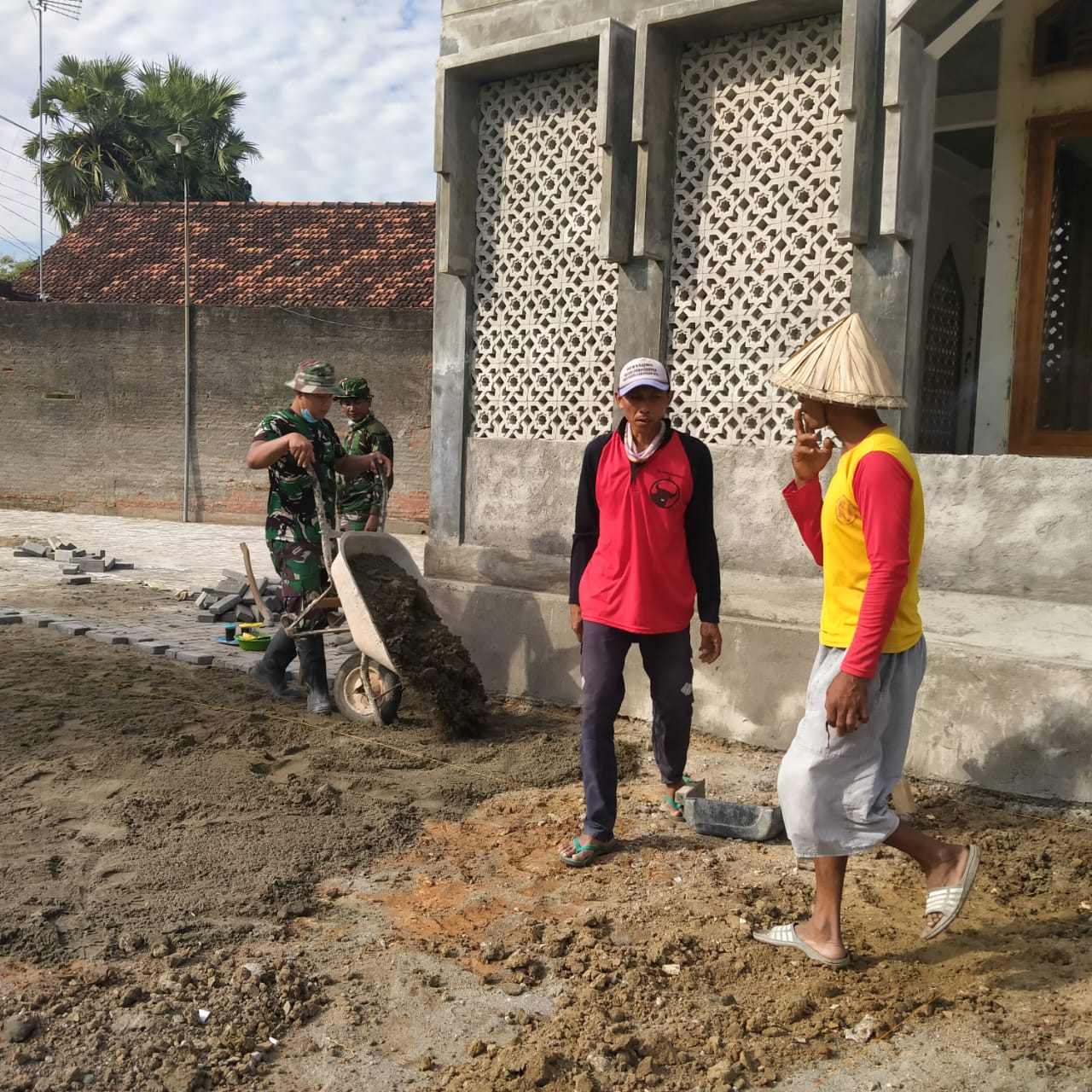 Serma Sunarto(38), salah satu anggota TNI tim satgas TMMD ke 111 Kodim 0718/Pati yang berasal dari satuan Koramil 12/Margorejo yang saat itu terlihat sedang menuangkan material pasirnya dipelataran masjid, setelahnya kembali untuk pengambilan berikutnya, begitu seterusnya.