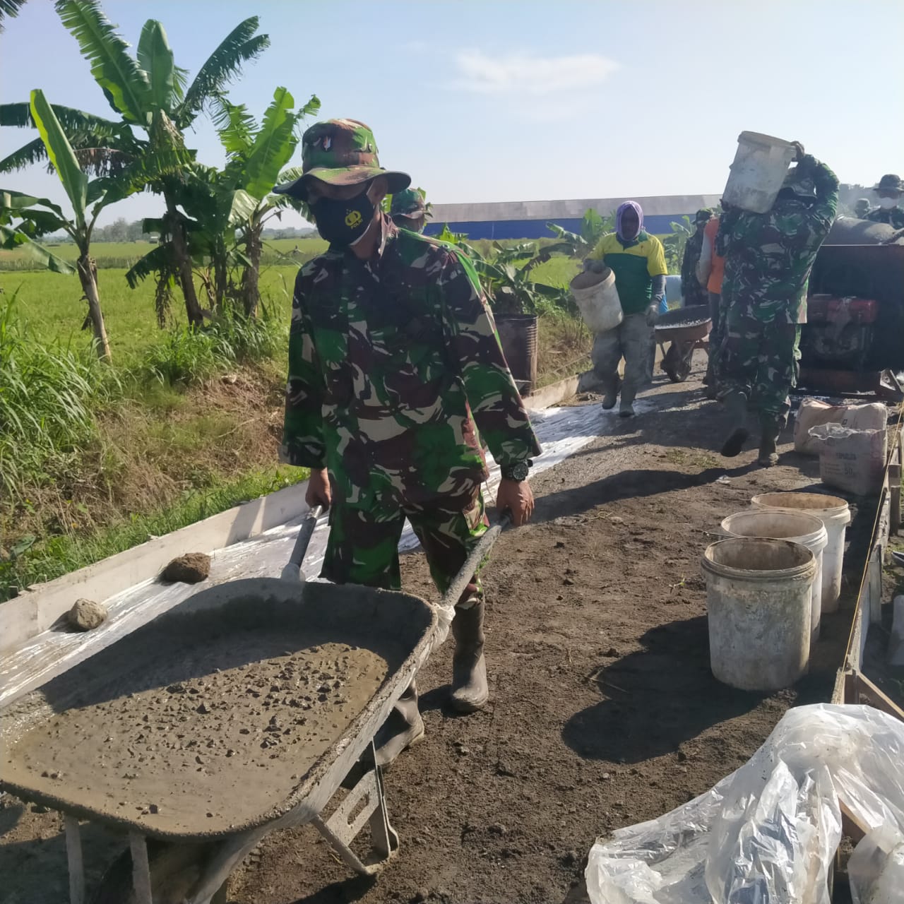 Serda Fajar(39), adalah salah satu anggota satgas TMMD yang selalu terlihat bersemangat dalam bekerja, dengan setianya dia terlihat menguatkan jari jemarinya melingkar, menggengam tongkat angkong, lalu mendorongnya menuju lokasi pekerjaan pengecoran.
