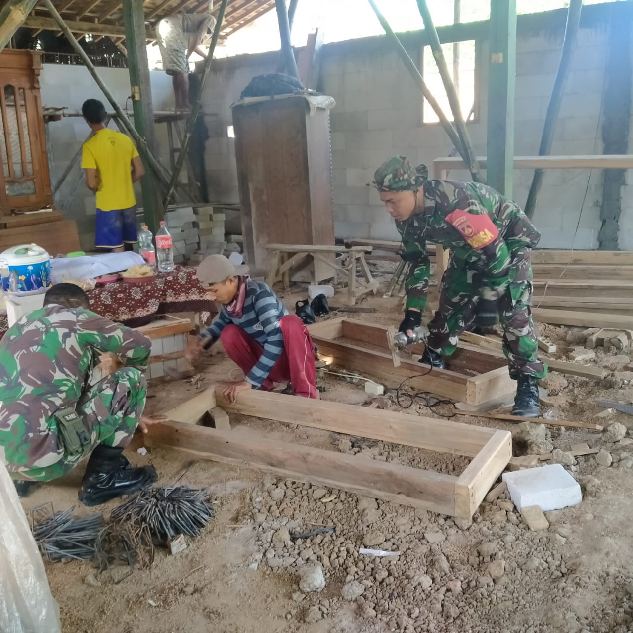 Tampak terlihat Serda Muslimin dan tim satgas yang lain ikut membantu Parmin (60), tukang kayu yang dpercaya untuk pembuatan kusen pintu dan jendela , mereka berusaha membantu apa yang mereka bisa.