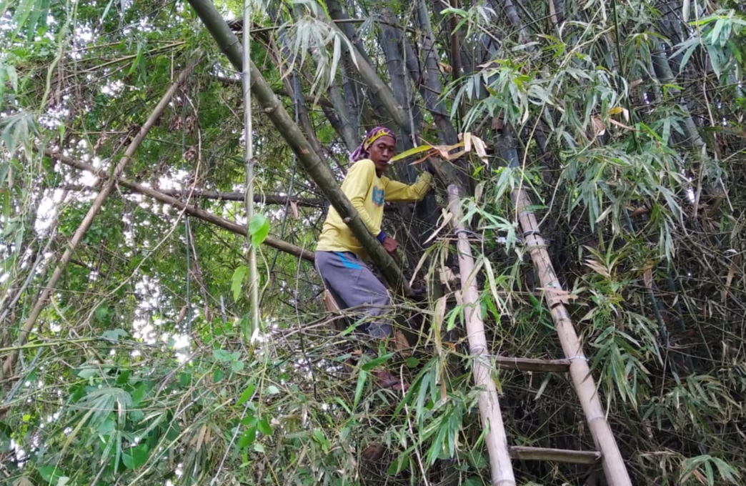 Mereka sudah mulai mempersiapkan acara penutupan kegiatan TMMD yang rencananya akan dilaksanakan tanggal 14 Juli 2021 mendatang. Seperti terlihat Darsono (35) warga Dukuh Kalimati, Desa Tamansari, Kecamatan Jaken, sedang memotong bambu untuk mendukung acara penutupan kegiatan TMMD nanti,