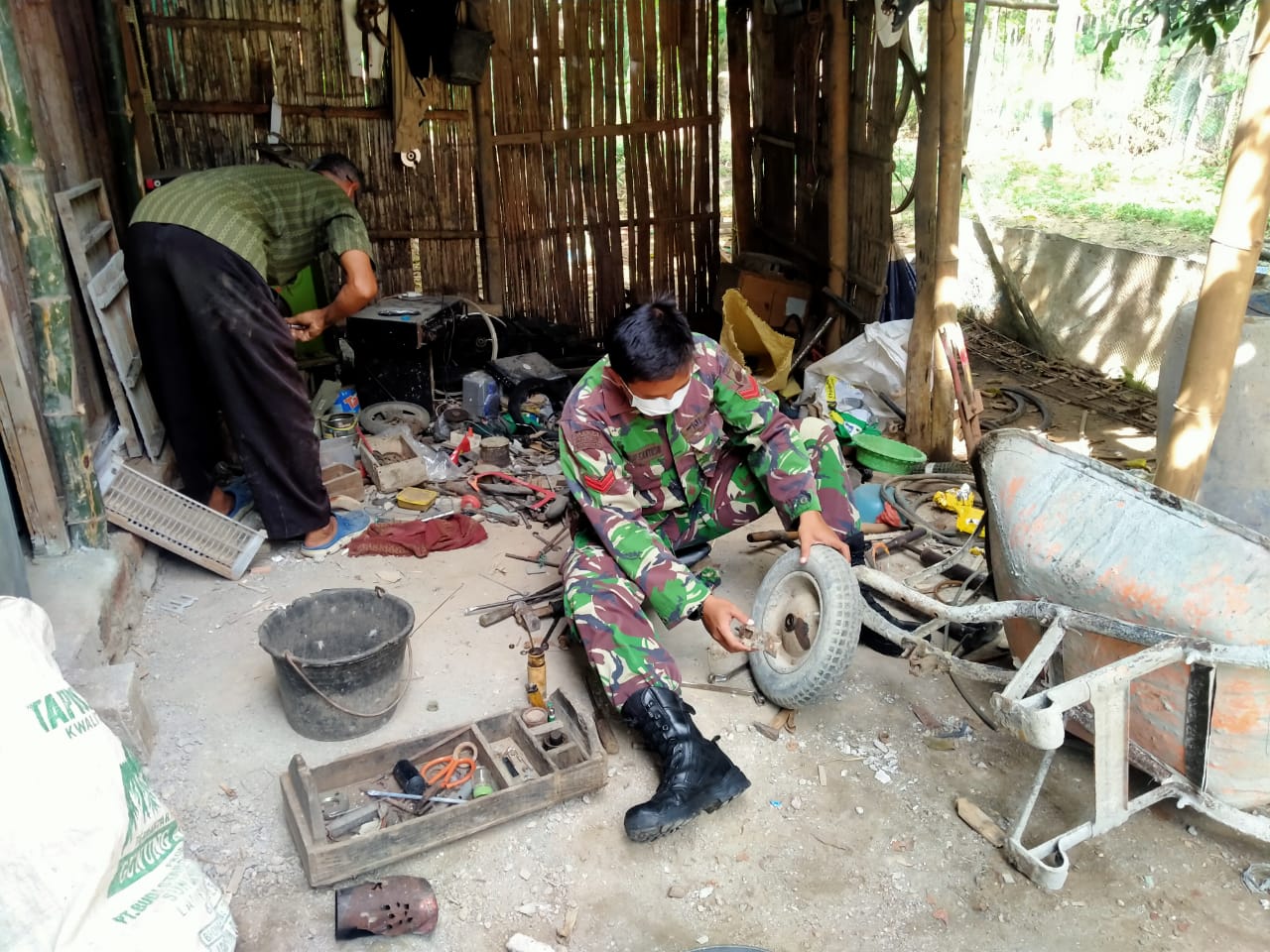 Pati – Pengalaman berharga bagi salah satu anggota satgas TMMD Reguler ke 111 Kodim Pati Koptu Irwan yang didapatnya selama pelaksanaan TMMD. Pasalnya ia saat ini mampu memperbaiki peralatan kerja angkong baik rusak ringan maupun berat. Awalnya beberapa angkong yang rusak berat sering dibawanya kebengkel milik Sutris (52) warga Desa Tamansari, seiring berjalannya TMMD keakraban diantara mereka pun terjalin sehingga Koptu Irwan belajar mereparasi angkong dibengkel tersebut.