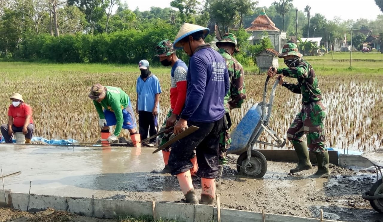 Pati-Betonisasi jalan sepanjang 1450 meter di desa Tamansari kecamatan Jaken kabupaten Pati dalam program TMMD Reguler 111 sudah 72 % dan hampir mendekati pada tahap ahir.