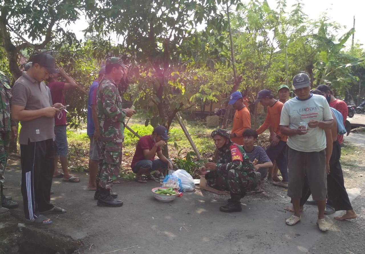 Pati – Kebersamaan dan kekompakan anggota Satgas TMMD Reguler Ke-111 Kodim 0718/Pati dengan warga masyarakat Desa Tamansari, Kecamatan Jaken, Kabupaten Pati, Jawa tengah tidak hanya pada saat bekerja di lokasi sasaran fisik TMMD, saat istirahat makan pun terlihat kompak penuh keakraban, Kamis (10/6/2021).