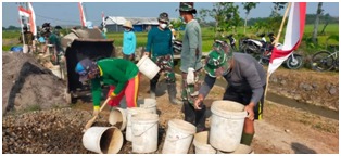 Dengan semangat 45 mari kita sukseskan pembangunan jalan penghubung antar desa biar dapat meningkatkat kesejahteraan masyarakat . Dengan menggunakan alat bantu mesin molen para anggota Satgas TMMD kelihatan Sangat Semangat dalam melakukan pekerjaan proses pencampuran bahan seperti pasir,batu kricak dan semen . Para Anggota Satgas dan Masyarakat menunjukan ketrampilannya dalam megoperasikan mesin molen tersebut dalam pengerjaan membangun jalan penghubung antara Desa Sumberarum dan Desa Tamansari Kec. Jaken Kab.Pati.