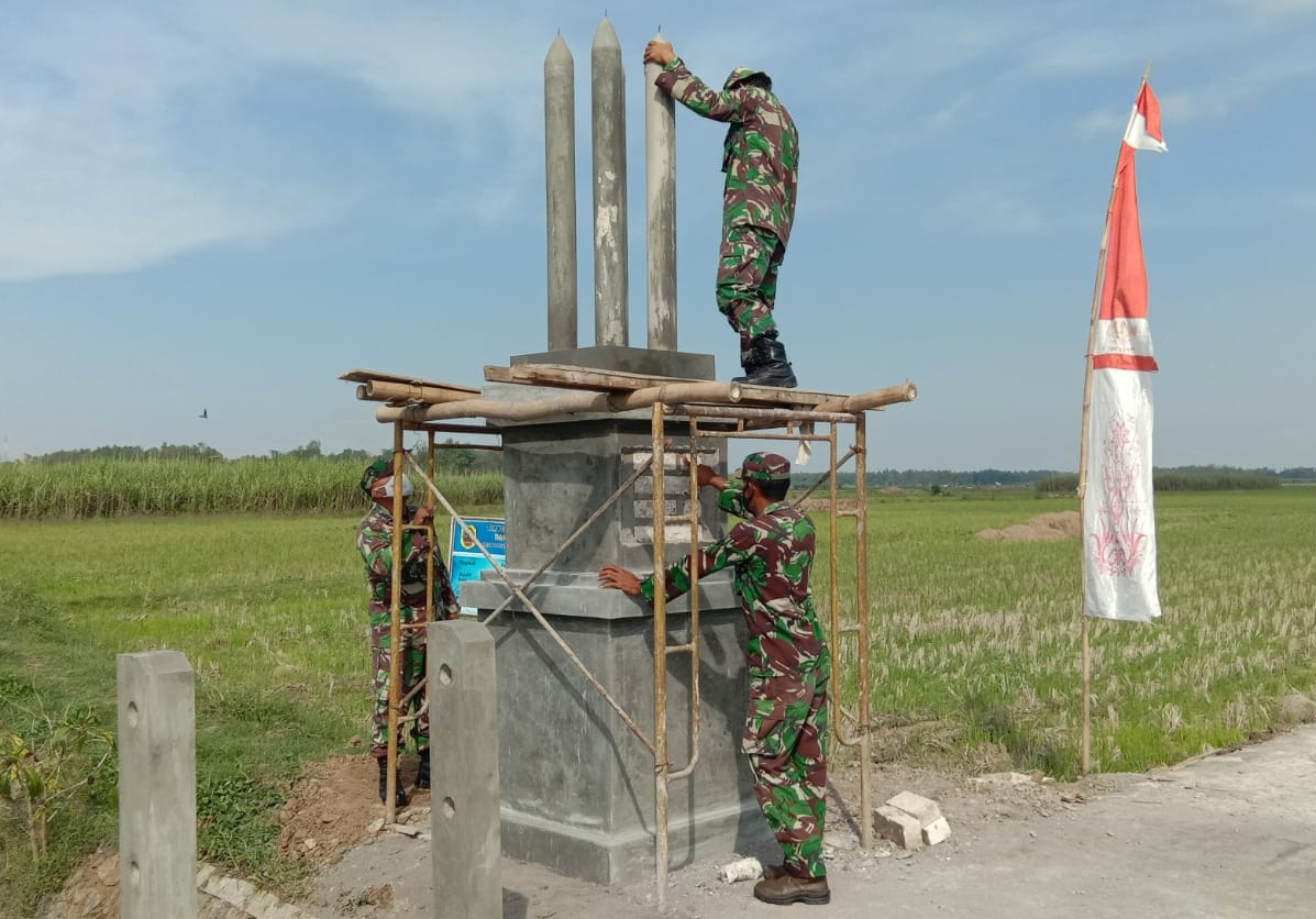 Pati – Luar biasa kerja Sertu Hartono dan tim dalam pembuatan Tugu Prasasti TMMD Reguler ke-111 Kodim 0718/Pati di Desa Tamansari, Kecamatan Jaken, Kabupaten Pati, Jawa tengah. H-2 menjelang penutupan TMMD, bangunan itu sudah memasuki finishing.